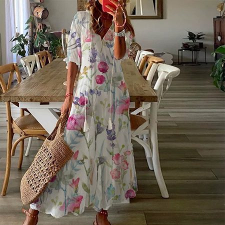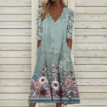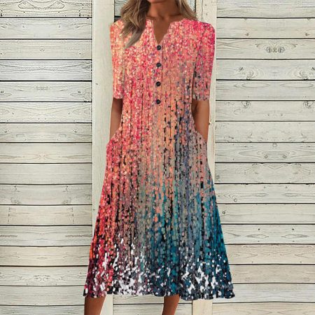 $65.99Original price was: $65.99.$46.99Current price is: $46.99.Description: Pattern Type: Print V-neck Sleeve Length: Half Sleeve Dress Length: Midi Side Pockets Silhouette: A-line Material: 40% Elastane, 60% Rayon Machine Washable Size Chart: Size Bust Length Sleeves inch cm inch cm inch cm S 38 96 46 117 11 29 M 39 100 47 120 12 30 L 41 105 48…