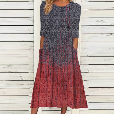 $62.99Original price was: $62.99.$42.99Current price is: $42.99.Description: This midi-length prairie dress will become your favorite go-to with its rich red to blue ombre ornate print. The crewneck collar and half sleeves make it easy to mix and match with a jacket. A loose-fitting waist with double side pockets and pleats finish the look. Pattern Type: Print Sleeve…