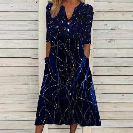 $69.99Original price was: $69.99.$47.99Current price is: $47.99.Description: A royal blue and cobalt shade intermingle on this long summer dress covered in white line streaks and dots reminiscent of constellations. A button-front round collar v-neckline, three-quarter length sleeves, and flared midi dress silhouette keep it versatile, finished with side pockets. Pair it with flats, heels, a black or brown…