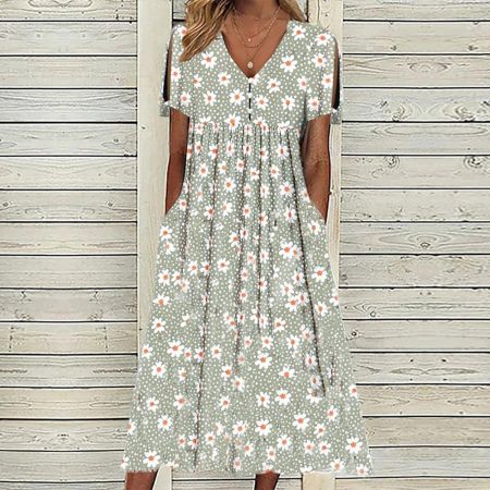 $67.99Original price was: $67.99.$50.99Current price is: $50.99.Description: Pattern Type: Plain V-neck Sleeve Length: Short Sleeve Dress Length: Midi Silhouette: A-line Side Pockets Material: 35% Elastane, 65% Rayon Machine Washable Size Chart: Size Bust Length Sleeves inch cm inch cm inch cm S 36 92 46 117 5 12.5 M 38 96 47 120 5 13 L 40 101…