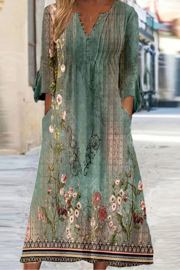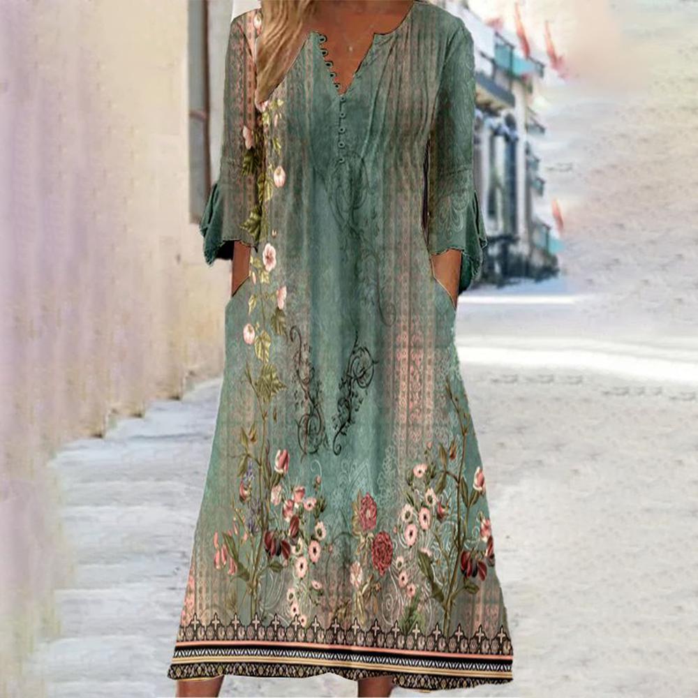 Description: Neckline: V-neck Sleeve Length: 3/4 Sleeve Dress Length: Midi Pattern Type: Print Silhouette: A-line Side Pockets Material: 45% Elastane, 55% Rayon Machine Washable Size Chart: Size Bust Length Sleeves inch cm inch cm inch cm S 36 92 46 117 18 45 M 38 96 47 120 18 46 L 40…