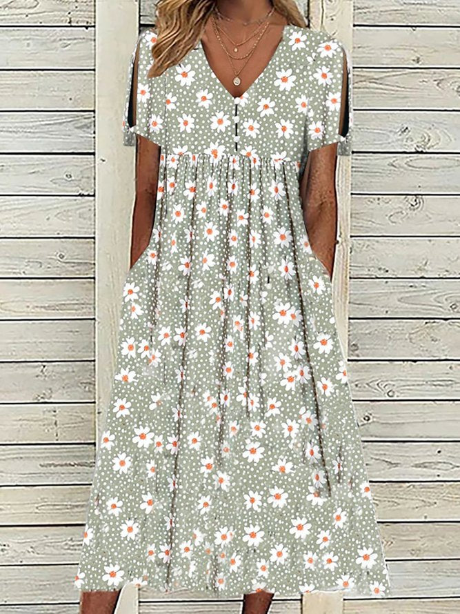 Description: Neckline: V-neck Sleeve Length: Short Sleeve Dress Length: Midi Silhouette: A-line Pattern Type: Floral Side Pockets Material: 45% Elastane, 55% Rayon Machine Washable Size Chart: Size Bust Length Sleeves inch cm inch cm inch cm S 38 96 46 117 8 21 M 39 100 47 120 9 22 L 41 105 48…