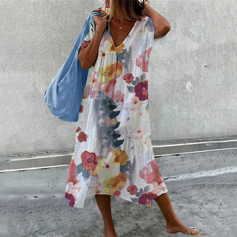 Description: Neckline: V-neck Sleeve Length: Short Sleeve Dress Length: Midi Pattern Type: Print Silhouette: A-line Material: 35% Elastane, 65% Rayon Machine Washable Size Chart: Size Bust Length Sleeves inch cm inch cm inch cm S 51 130 46 118 11 28 M 53 134 47 120 11 29 L 55 139 48…