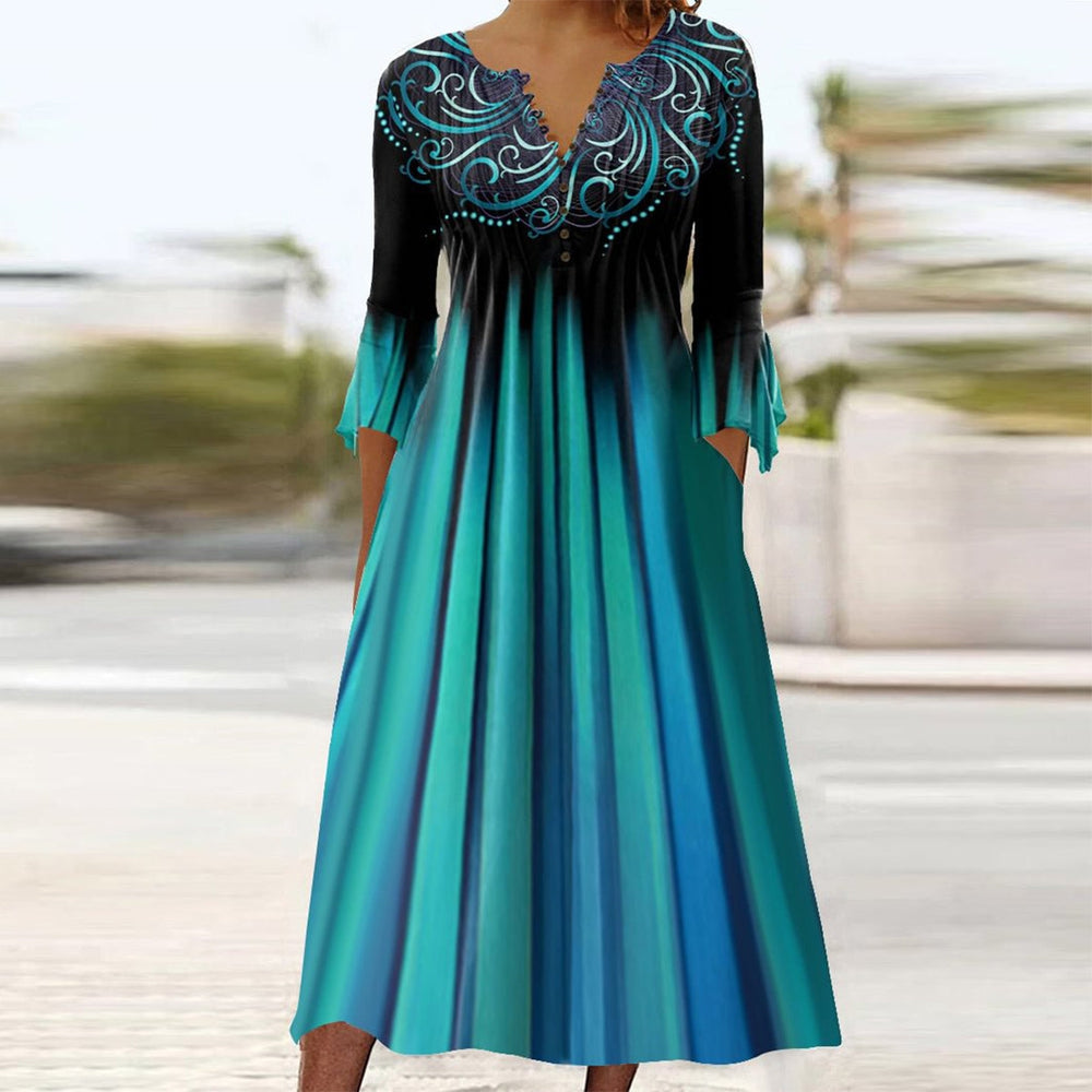 Description: This sophisticated midi dress says it all, with ombre green stripes running vertically down the mid-calf silhouette. The short sleeves with a luxe swirling ribbon print and v-neck give it a glam detail. The cinched bodice with ¾ sleeves complements the flared hem. Neckline: Round Neck Sleeve Length: 3/4 Sleeve Dress…