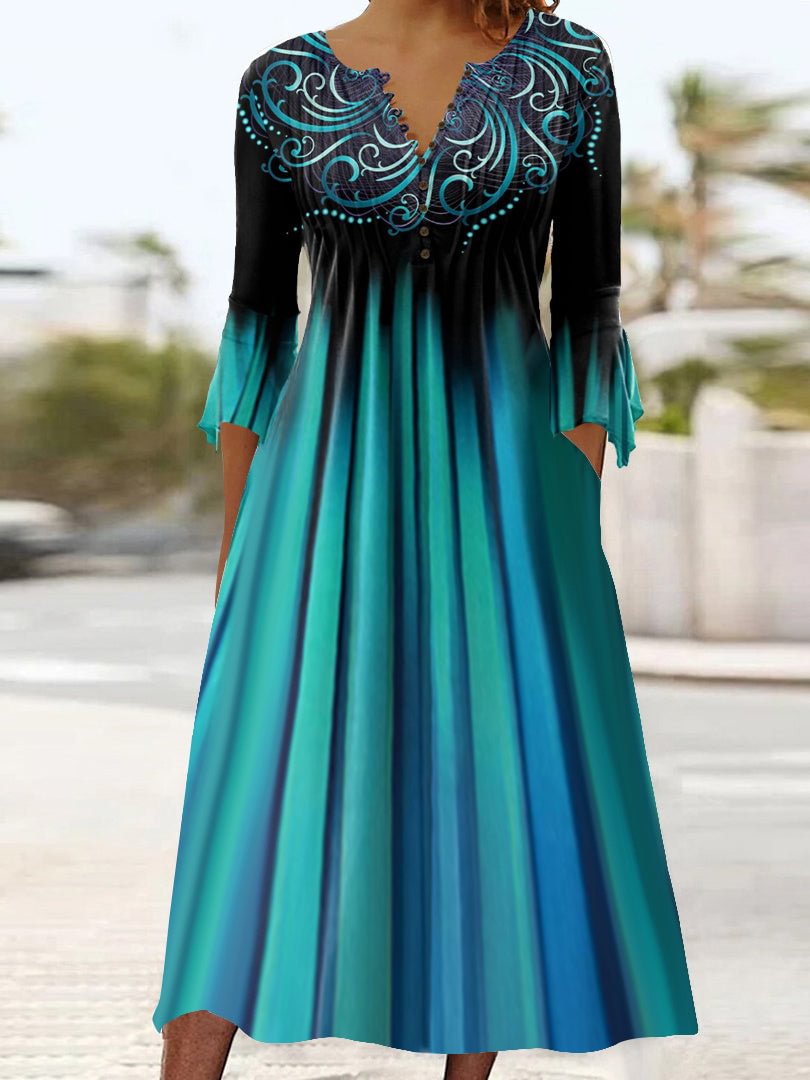 This sophisticated midi dress says it all, with ombre green stripes running vertically down the mid-calf silhouette. The short sleeves with a luxe swirling ribbon print and v-neck give it a glam detail. The cinched bodice with ¾ sleeves complements the flared hem.